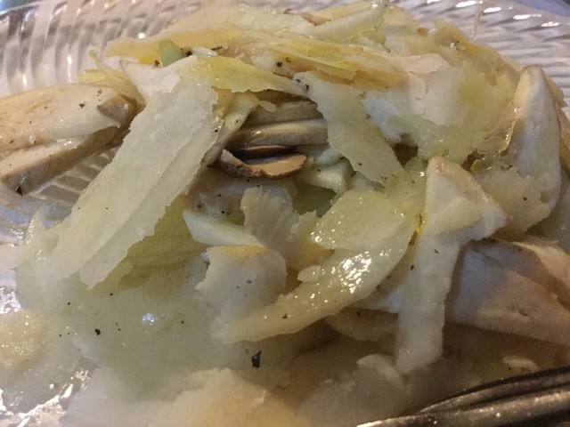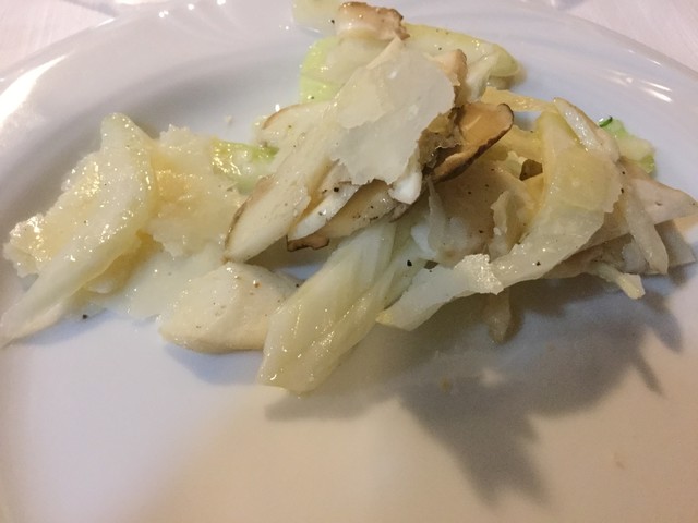 1.朝穫りの地元ボローニャ産ポルチーニ茸、パルミジャーノレッジャーノ、セロリのサラダ。