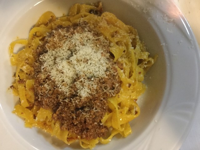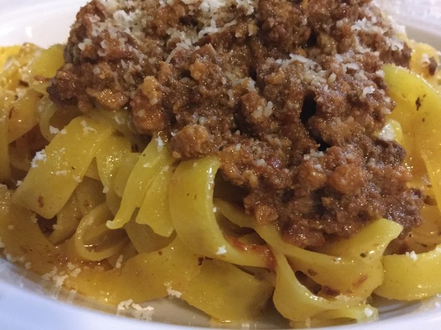 ちなみに、ITALYIIというサイトの情報を引用しますと、ボロネーゼの原材料は、『牛肉、パンチェッタ、玉葱、人参、セロリ、トマトペースト、肉のブイヨン、赤ワイン、そして任意で牛乳またはクリーム、と制限されてい』るそうです。※この情報源のリンクはこちら。※