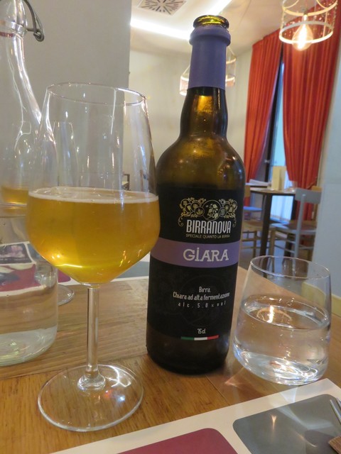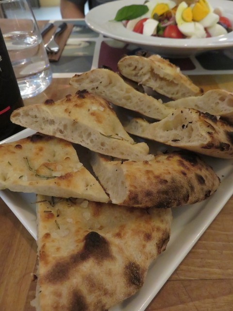 注文したのは、ここの店名にもなっている看板メニュー。ビザ生地を最初からカットし、ブッラータ(?)とプロシュートがきれいに盛られています。ビザ生地は淵がかなり厚いですが、ナポリピッツァとは全く異なり、もっちりした密度の高いパン生地のようです。そのため、胃にはたまるけど、保温能力が高いです。