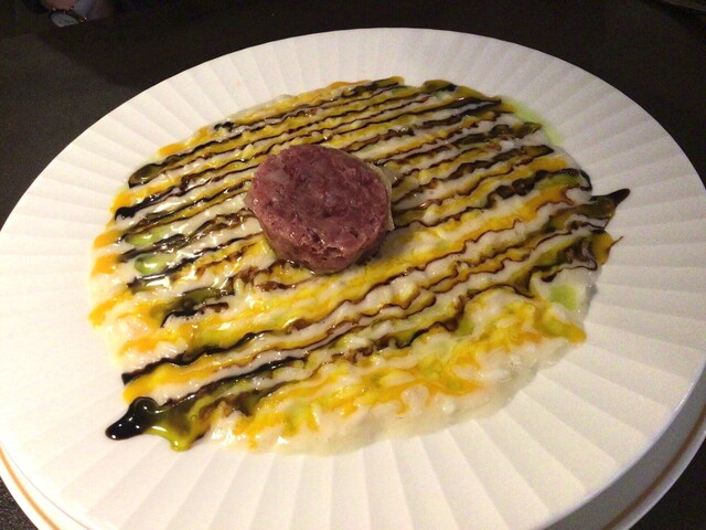 (パルミジャーノレッジャーノチーズ、モデナの豚肉ソーセージ、サバイオーネソース、モデナのバルサミコ酢とのカルナロリ米リゾット)