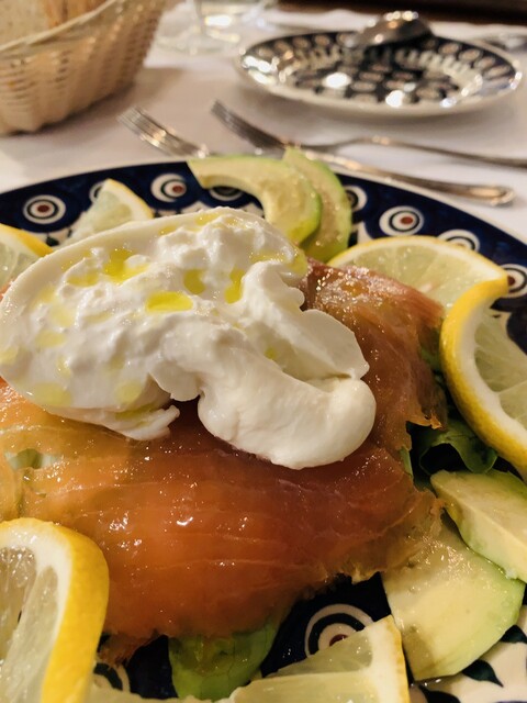 ■SmokedSalmon,BurrataadnAvocadoonGreensalara(€15.00≒1,800円)