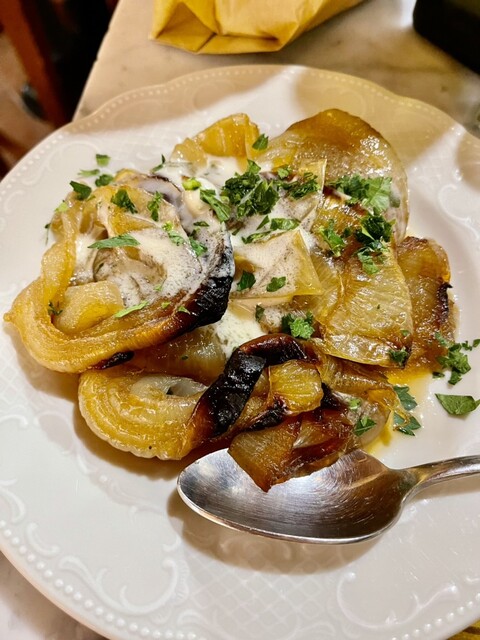 ついでにコントルノでCippolle al forno con crema di parmigiano:パルミジャーノソースが掛かった焼き玉葱も食べちゃう。