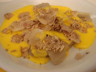 セロリのようなイタリア野菜にチーズのソース 白トリュフがけずら。