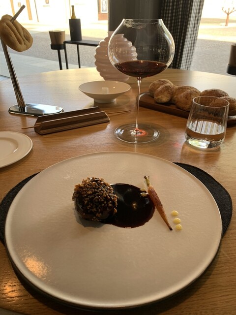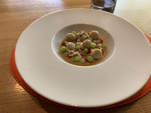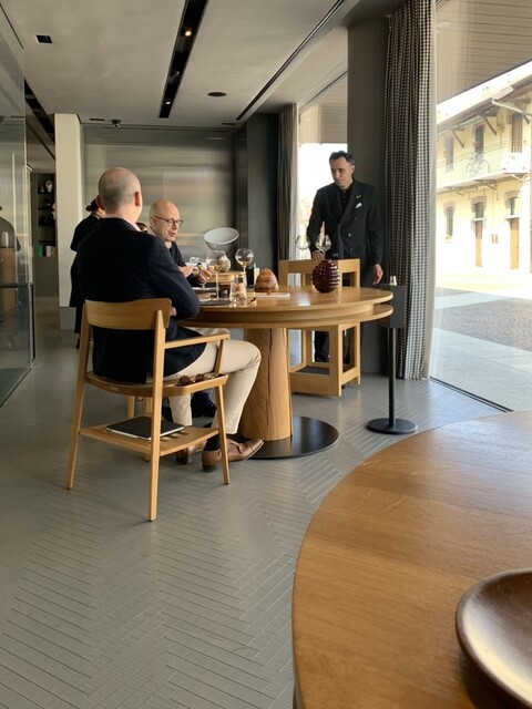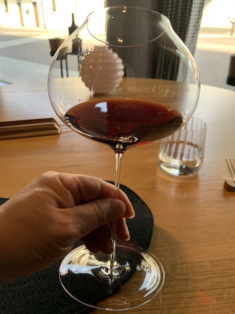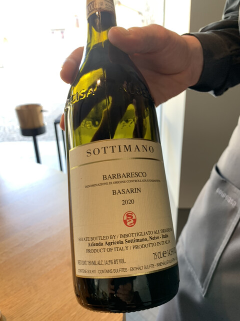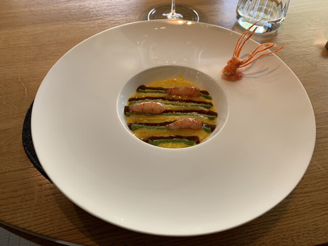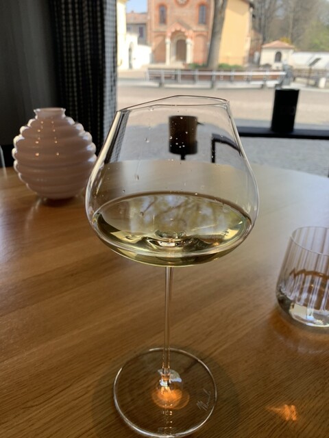 ミラノ郊外の2つ星、アクセス悪いのに平日ランチで満席、お値段内容にしてはお安めということもあるのかも。シェフ挨拶に来ましたが、写真よりちょいとお歳召した感じ。お料理メニュー4択、トラッドにしましたが、なかなかです。グラス飲み口ウェイブ、飲みやすい、聞くと当店ソムリエのサイン入特注グラス、良く言ってくれたとうれしそうに説明されました(笑)。美声マネージャー、奥さん日本人なのに日本語まったくダメだそうです( ̄▽ ̄;)