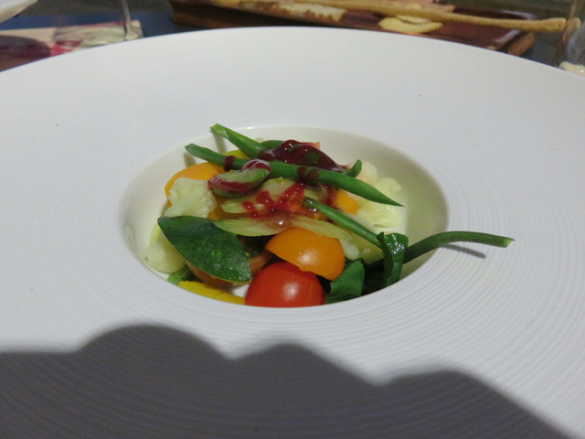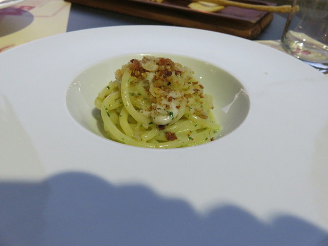 次のスモークうなぎとやらも20ユーロ、何これ?と思ってしまいました。生臭く、食感がなく、柚子大根やボッタルガ添えという組合せもイマイチ。もちろん日本のようなウナギを期待してるわけではなく、美味しければ何でもありなんですが、良さが全く分かりませんでした。
