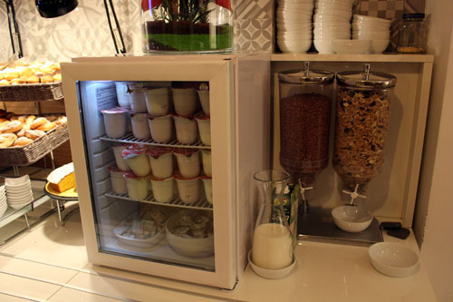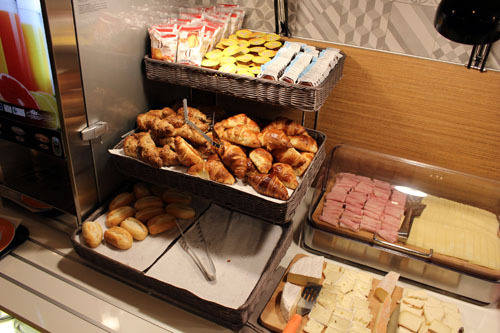 クロワッサンなどのパン、ハム、チーズ、甘いパン、ケーキ、ヨーグルト、2種類のシリアル、