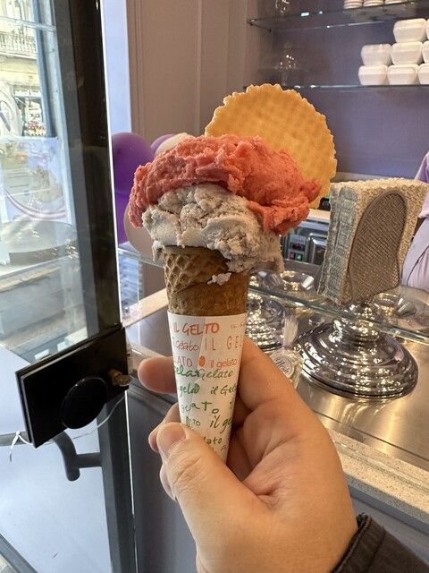 ラベンダーとイチゴの2スクープをコーンで注文。どちらも濃いジェラートで美味しかったです。