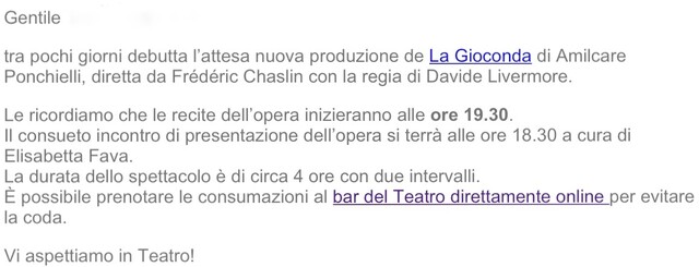 「開演 19:30 オペラは四時間に及びます。ついては観劇の幕間(Intervallo、Intermission) に飲み物と軽食を用意しています。ご予約いただければスムースにご提供することが可能です。」