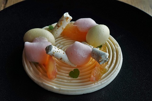 グレープフルーツのぐるぐるに、パイナップルのシャーベット、レモンクリーム、アーモンドのカンパリ風味