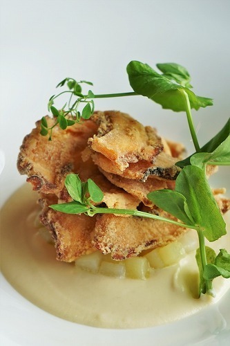 タコのフライ カリフラワーのクリームソースと蒸しジャガイモの角切りの上に