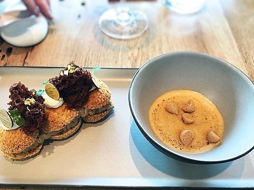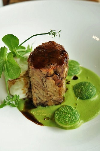 牛肉の煮込み ズッキーニとミントのクリームソースとペコリーノのムースを添えて
