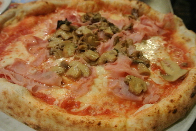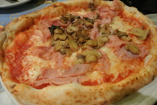 ピザ:生ハムときのこ ビアンコが食べたくてこれに。ピザは、ミディアムで日本のよりもやや大きめ。周りはもうひとサイズ大きいのをがっつり。焼きは浅めながら、額縁のもちもちはすごい。軽いね。キノコはマッシュルームと知らないのが2種類。味付けしてあって、これも抜群でした。3€から6€くらいで、食べたのは5.60€。水牛モッツァレラはなかったですね。ピザの種類が多く、ほとんど分からないイタリア語。しょうがねっか。