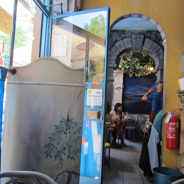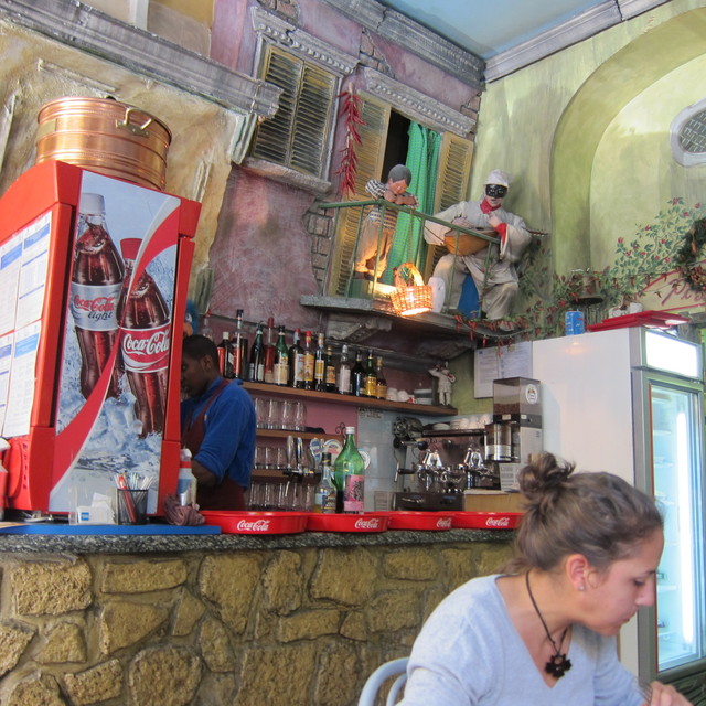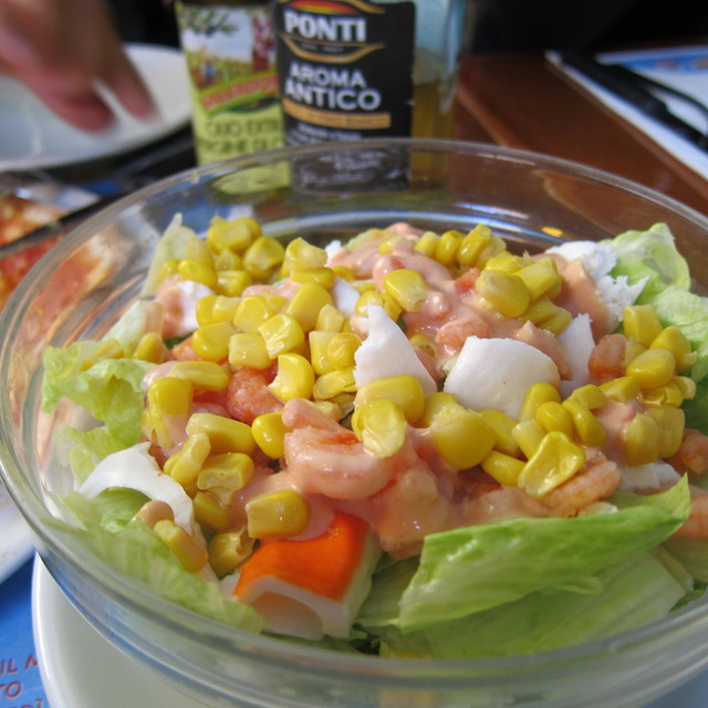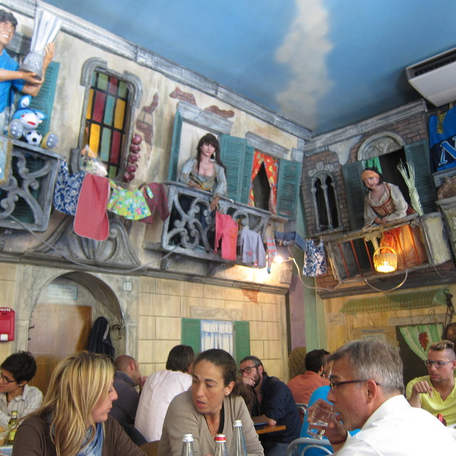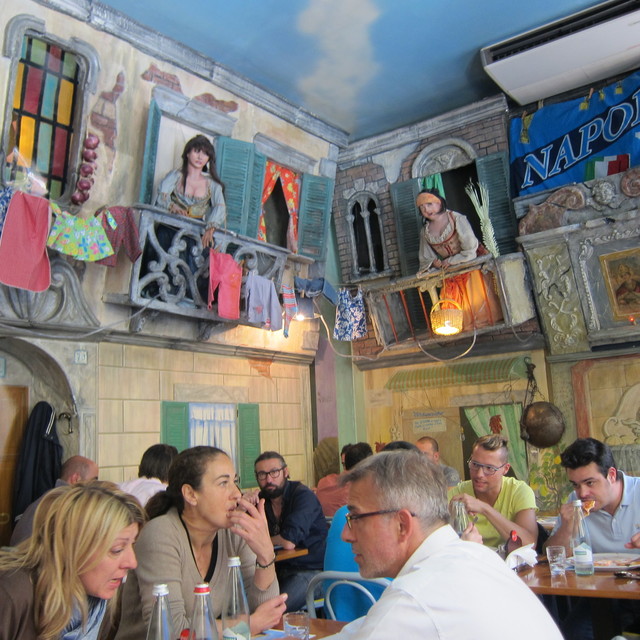 店内意匠が奇抜で楽しいです。南イタリアの街角をそのまま実物大で再現していて、洗濯物まで干してあるよん。表参道のフェローズののりで、タクシーのアートにはびっくり。写真を見てください。色調は中世の家の中のようなペイントでしたね。壁にはイスキア島の大きな絵。お客さんは、家族連れ、職場仲間、カップルなどで、観光客風はわれわれだけ。まだ日本の雑誌には出ていないのかな。そのうち、これを見てどの雑誌にも載るようになるでしょう(笑)。