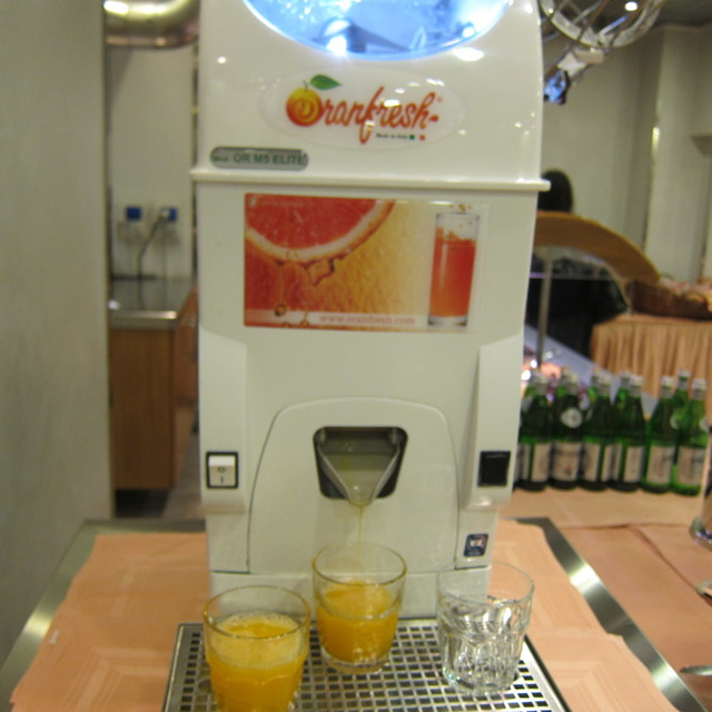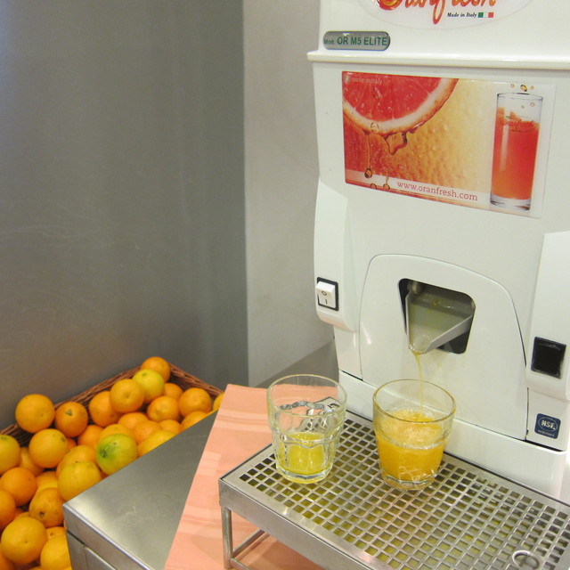 生ハムが8種類、シェブール3種類。オレンジを機械に投入すると自動で絞ってジュースだけが出てきます。
