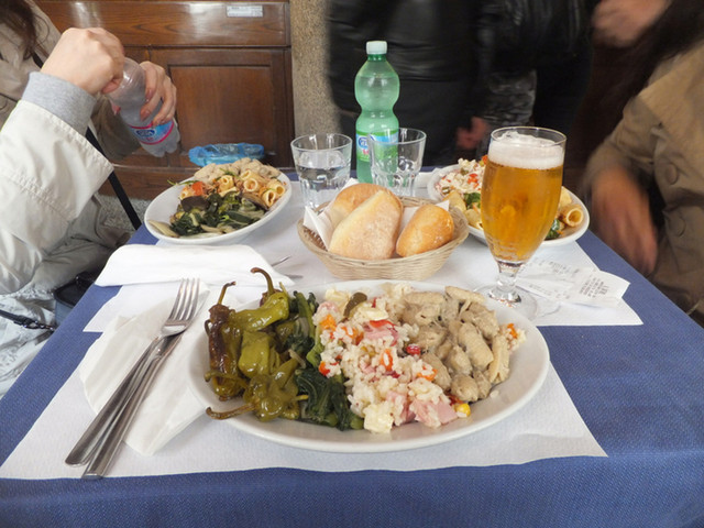 ドゥオーモ(大聖堂)近くの人気店。夜は本格的ミラノ料理を出すレストランですが、昼は地元の人が軽く食べるためによく利用しているようです。カウンターの店員に野菜やらパスタやらの料金を払って、ショーケースの...