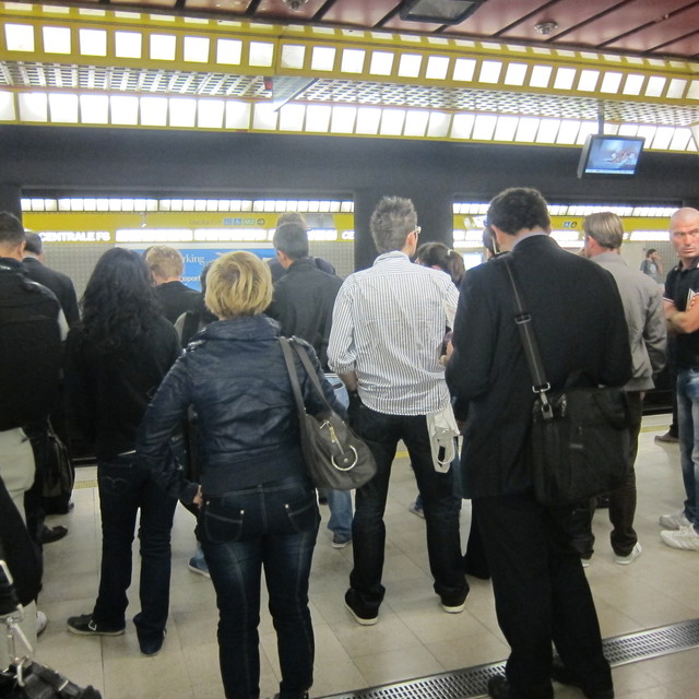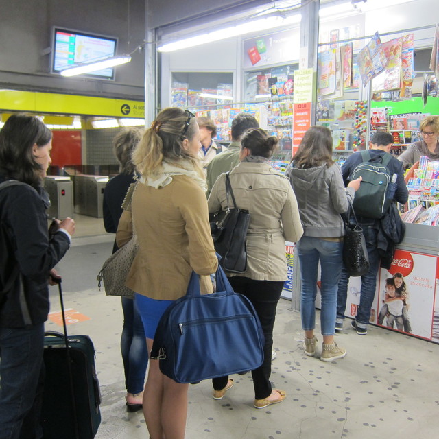 この日もしっかりホテルで朝食を食べます。いえ、パンは抜きで、生ハムとフルーツとフレッシュオレンジジュースだけ。朝食が終わって決めていた時刻に中央駅の地下鉄乗り場に行きます。ここで見たものは。同行の方とふたりで大興奮。だって、いつも閑散としていたところに行列ができているんですもん。これにはびっくり。出勤タイムですが、まさかまさかの行列。新聞買ったり、キップを買ったり、スナック、飲み物を買ったり。込んだ地下鉄に乗ってドウォモまで。そこからペック本店まで歩き、シミュレーション通り2階へいきます。