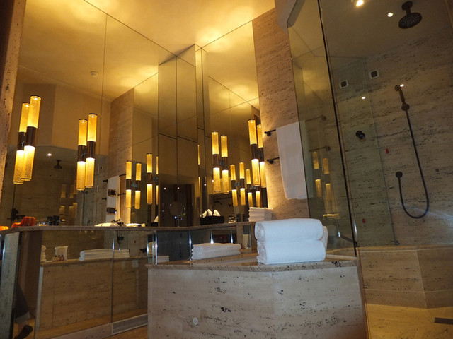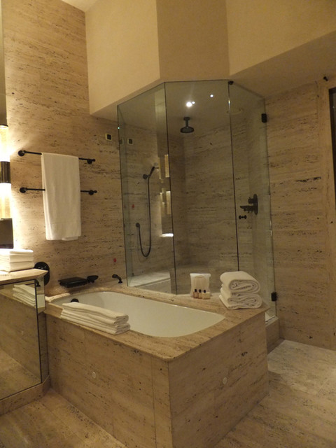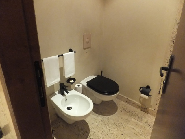宿泊したデラックス・ツインルームの洗面浴室はトラバーチンが豪華です。マウスウォッシュはありますが、歯ブラシ、歯磨き粉、ひげ剃り、シェービングフォームは常備されていません。フロントに言えば準備してくれますが。浴槽と独立したシャワールームの床が秀逸。中央に向かって緩やかに傾斜しており水はけが良いだけでなく、全く滑らないので安全です。湯温と湯量も十分です。トイレは当然シャワーと暖房便座は付いていません。ビデは標準ですから女性は使い慣れると良いかも。