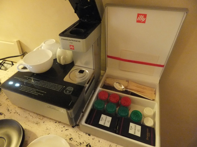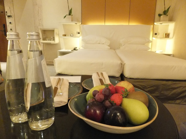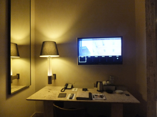 エド・タートルらしいシンメトリーの内装の寝室も3.5mはあろうかという高い天井。頑丈な石の壁で隣の音や振動は全く分かりません。ベッドは柔らかくて良いのですが、隣に寝る人の振動が伝わるマットレスなので今日的とは言えません。ルームキーピングの度に無料のミネラルウォーターが補充されます。テレビはサムスン製で使いにくい。一応録画のNHKは見られます。イタリアの電源はタイプCのアダプターで。パソコンやデジカメ、携帯の充電器、最近のヘアアイロンなどは変圧器無しでOKのものが大部分。イタリアのメーカー「illy」のエスプレッソ・メーカーと、補充される無料のエスプレッソやお茶類。