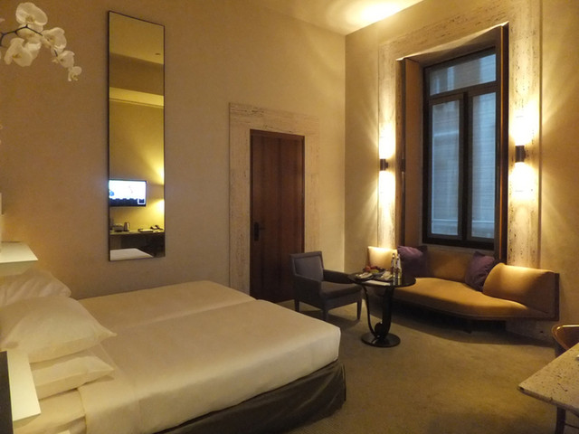 パークハイアットはハイアットグループの最上位グレード。パークハイアットミラノはミラノに六軒しかない5つ星+Lホテルの一つです。19世紀の建物を改築したのはアマン・リゾーツで有名なエド・タートル。トラバーチン大理石を多用したインテリアが素敵です。デラックス・ツインに4連泊しました。