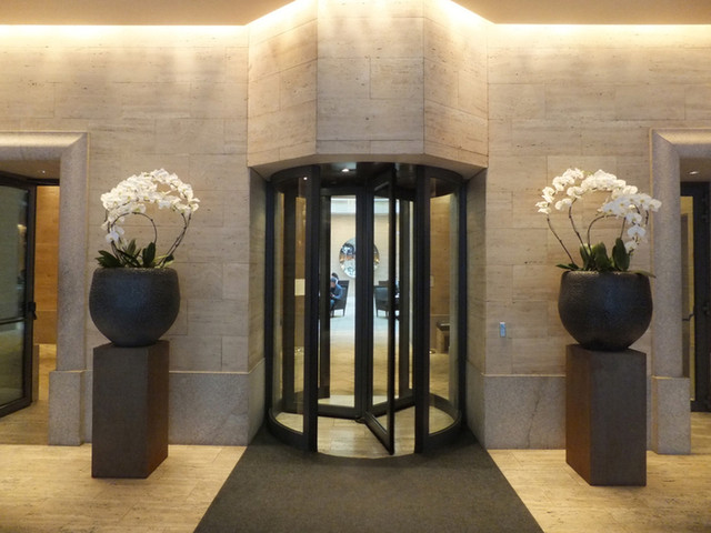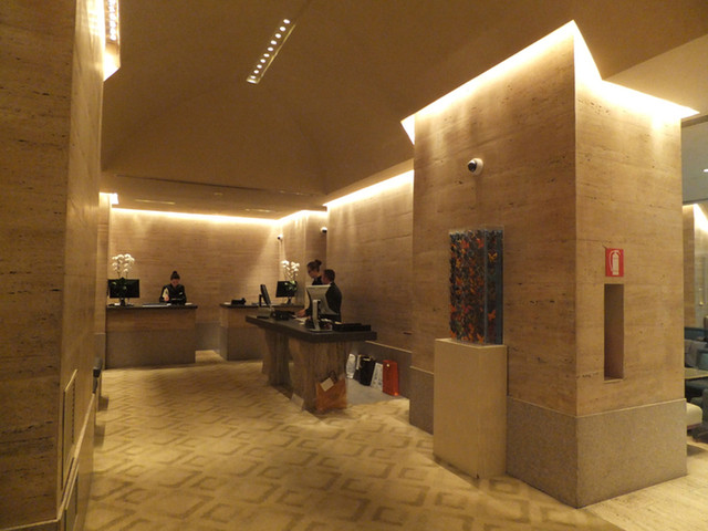 石造りの頑丈なエントランスから回転扉をくぐります。館内のあちらこちらで見られる胡蝶蘭の生け方(左右から円を描くように合わさる)が独特です。エントランスを入って左手がレセプション。壁はすべてトラバーチン。ホテルマン達は誰もが愛想が良いです。