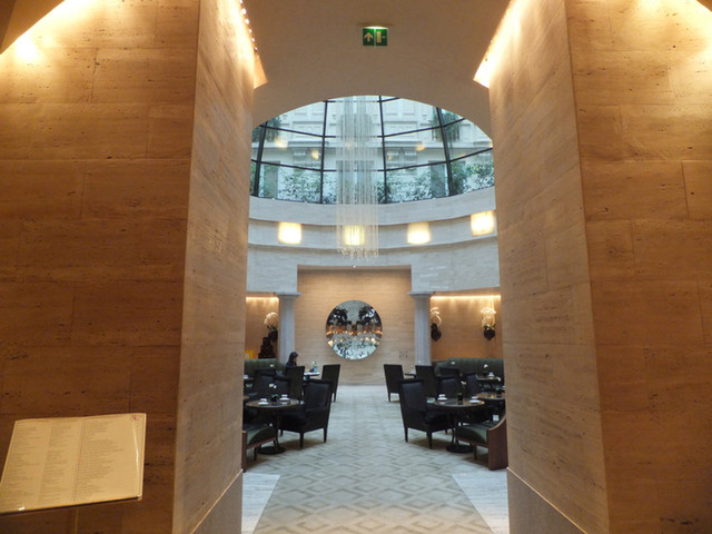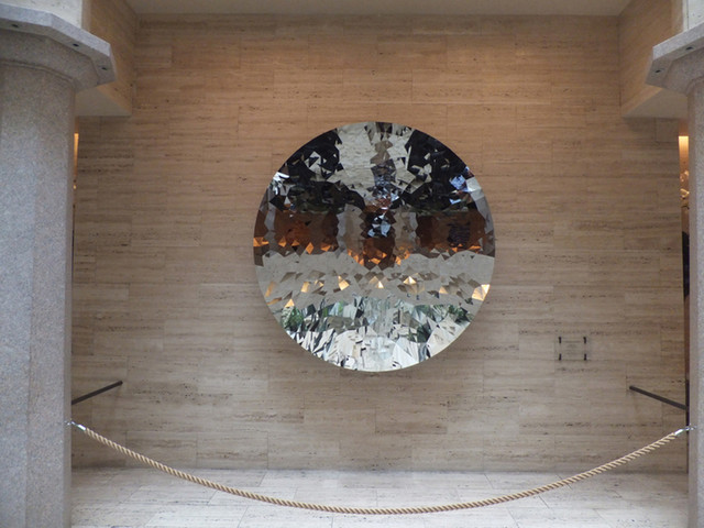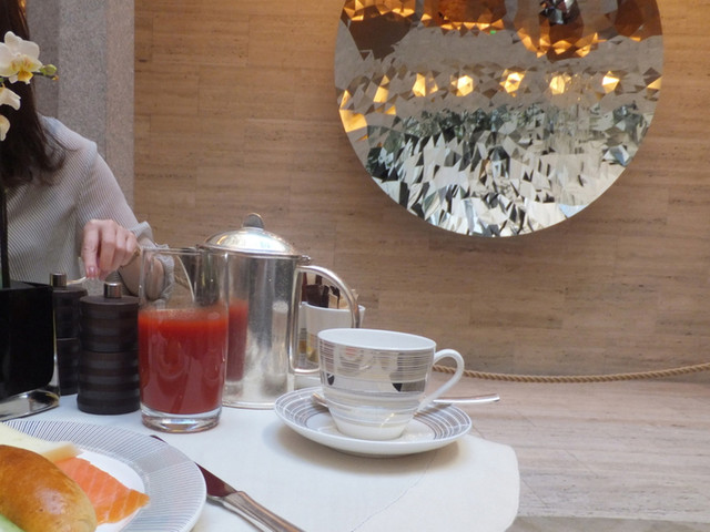 入って正面は朝食会場にもなるロビーのレストラン(The Cupola Lobby Lounge)。その正面の壁には、著名な現代美術家Lucio Fontana作の彫像が飾られていましたが、私たちが宿泊する少し前に10周年を記念してAnish Kapoorの作品に付け替えられました。アニッシュ・カプーアも活躍中の著名な現代彫刻家です。こんなところでカプーアが見られるとは思っていませんでしたので嬉しいです。ガレリアの天井を彷彿とさせる9mのガラスのドームからは青空が見られます。