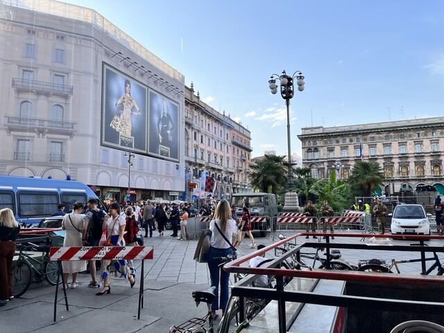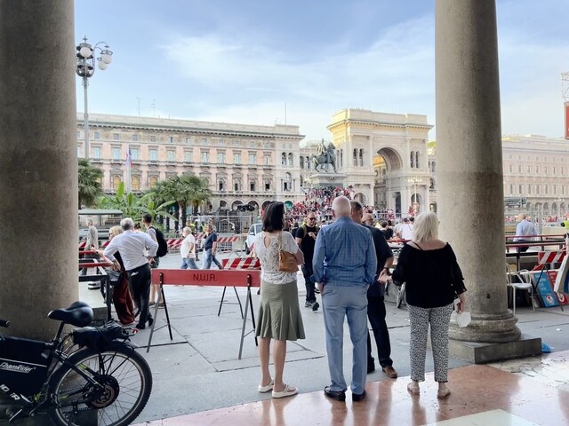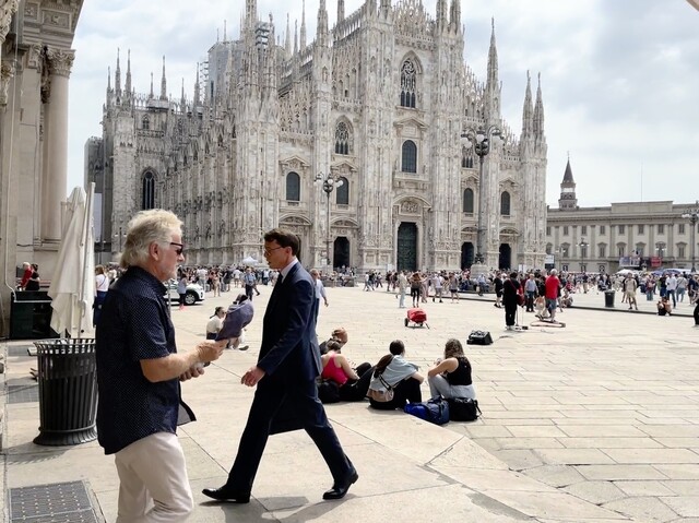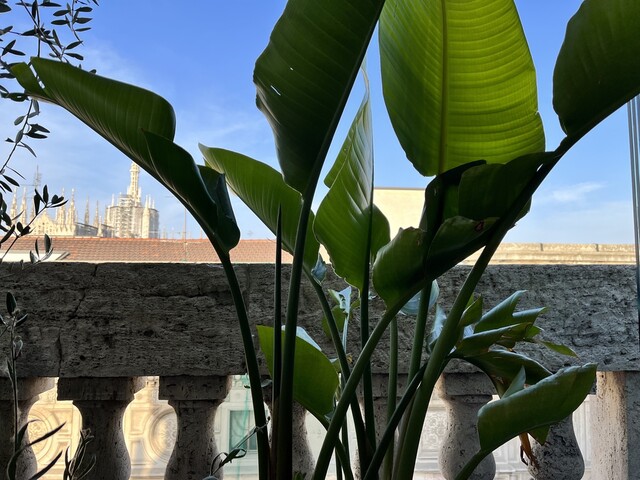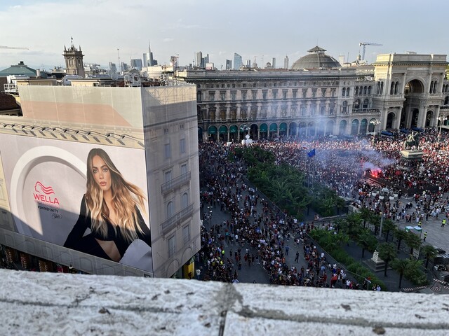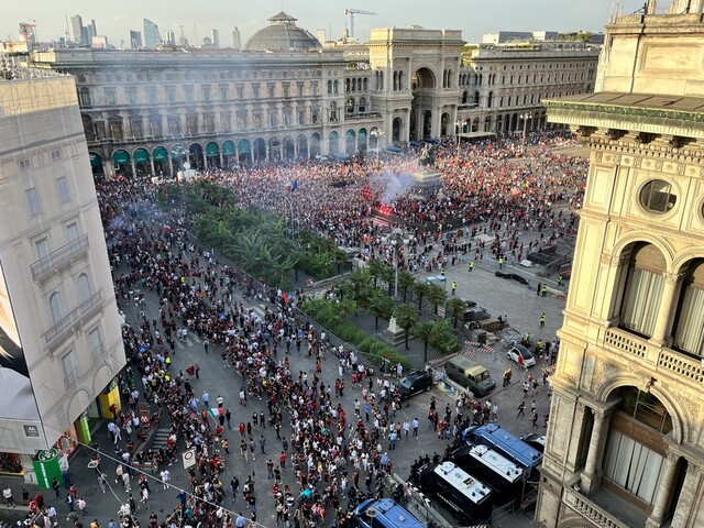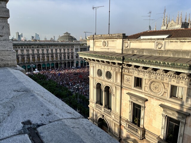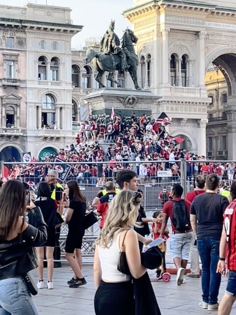 この間、イタリア人同士のようにたくさん喋って喉が渇きました。ジン・ソーダで乾杯、私はマティーニをお代わりでいただきました。テラス席に座った午後五時は客もまばらで静かだったのですが、次第にドゥオーモ広場から流れてくるクラブチームの応援歌(football chant、チャント)、笛、大声援、時より砲撃のようなドッカーンという大きな爆発音があり、何事かと思って石の手摺から広場を眺めると前日 Serie A での優勝が決まったACミランのサポーター達が広場を埋め尽くしていました。この集まりが予定されていたので「IL CAMPARINO TORNA IN GALLERIA」は臨時休業だったのです。地下鉄駅入り口も路面の公共交通も全て閉鎖され、ライフルを持った Carabiniere(国家憲兵) と 同じく Polizia locale(地元警察官) が装甲車を伴って警護しています。多分、翌朝までこの騒音は続くのでしょう。COVID-19で抑えられていた若者のエネルギーが迸っていましたが、ミラノのサポーターは皆マナーが良く、危険な感じは全くありません。