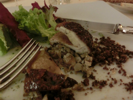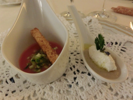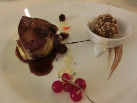 フォアグラと筍 ピーチとラズベリーとオニオン バルサミコのソース 添え物は マスカットのジャリーが入ったチョコレート