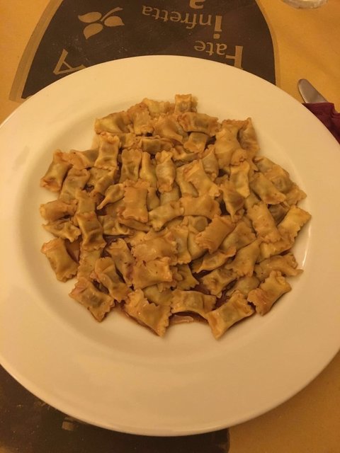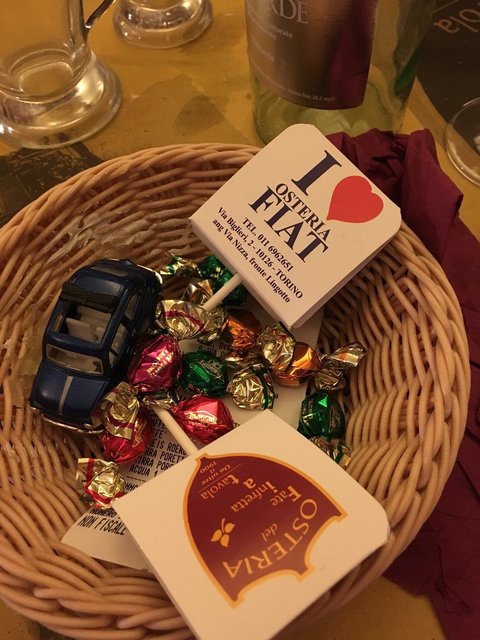 自動車メーカーのFIATは、Fabbrica Italiana Automobili Torino(トリノのイタリア自動車工場)の頭文字ですが、こちらのオステリアの名前はFate Infretta A Tavora(とっととテーブルに着席しろ)の略です。
