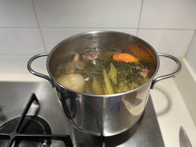 三日目の開始。骨から出てくる膠質のお陰でとろみがあり、ブラウンソースは不要かと思ったが、
