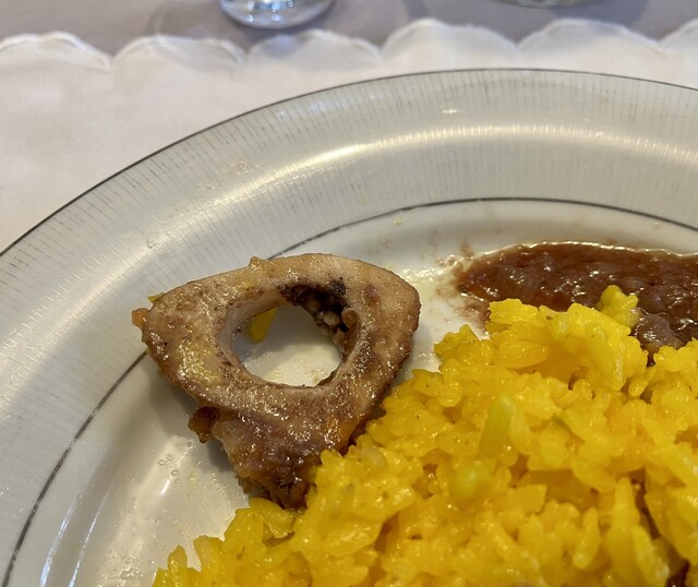 娘の作った正調オッソブーコ(Ossobuco alla milanese)は、Ossobuco という名前の通り、輪切りにした骨に孔が空いていて髄(midollo)が詰まっているものを指します。調理のポイントは脛肉の筋膜に切り身を入れて肉が反っくり返らないようにすることと肉を煮込む段階で一枚ずつの脛肉が平らになって髄(midollo)が外れないようにすることだと教えてもらいました。