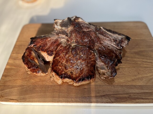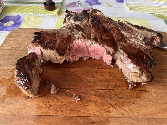 ピエモンテ牛のLボーン(L-Bone) は、サーロイン(sirloin) だけが骨に付いている (たったの19€/kg、日本の 1/10)