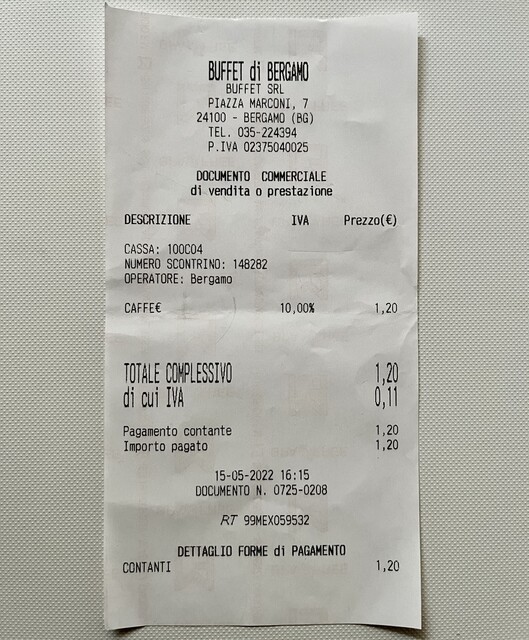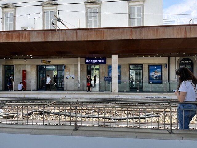 さて、余裕を持って早めに行動するタイプの私は、Bergamo 駅に出発一時間半前に到着し、構内のブッフェ(buffet) で Caffè を飲んで寛いでいたのですが、イタリアの鉄道は突然、番線が変更になったり遅れて到着するので構内放送に耳をそば立てていました。最近はイタリア語だけでなく英語でも案内があるので安心です。
