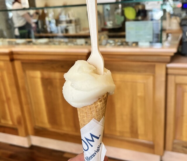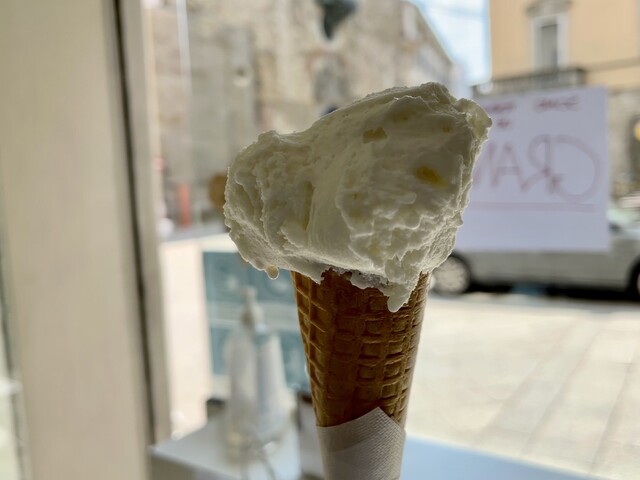 日本で全くと言って良いくらい冷菓(アイスクリーム、かき氷など) を食べない私ですが、日差しが強くても空気が乾いているイタリアで食べるジェラートは、何処の店のものもおいしくいただきました。こういう物はエアコンの効いた室内で食べるより、きれいな空気を吸いながら室外で食べた方がおいしいです。いいですね、空気の爽やかなイタリアは。