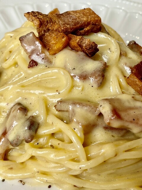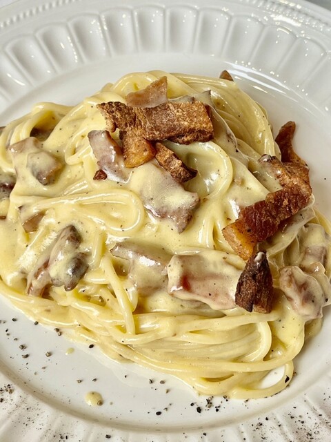 ワイフは珍しくフェトゥチーネのボロネーゼにしたので、では私がカルボナーラをいただいちゃいましょう。