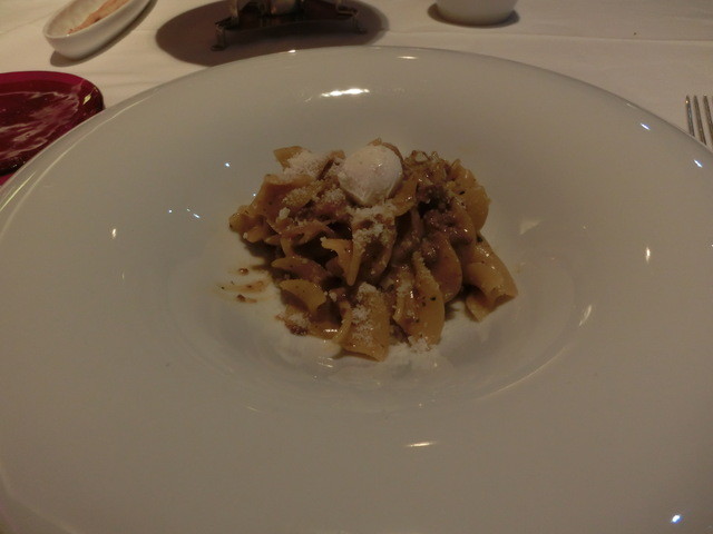 店内に入るとショッキングピンクの照明。男3人組にはどうも似合わないシチュエーションではあるが、まあそんなこと気にしてもしょうがない。席に着くと支配人の方が挨拶に来てくれた。どうやらカード会社の方からある程度のサービスをするようにということが伝わっていたようである。前菜は美味しいのだがまあいたって普通。日本でも食べれるレベルだ。しかし驚いたのはここのカルボナーラである。名前は分からないがねじったようなショートパスタでそこにかなり黄色い濃厚な味付けがしてある。食べると卵の味が濃い。今まで食べた中で最高のカルボナーラであった。最初はみんなでおとなしく食べていたのだが、ふと窓の外を見るとサンピエトロ寺院がきれいに見える。窓辺に写る室内のショッキングピンクの照明とのコラボが非常にきれいだった。