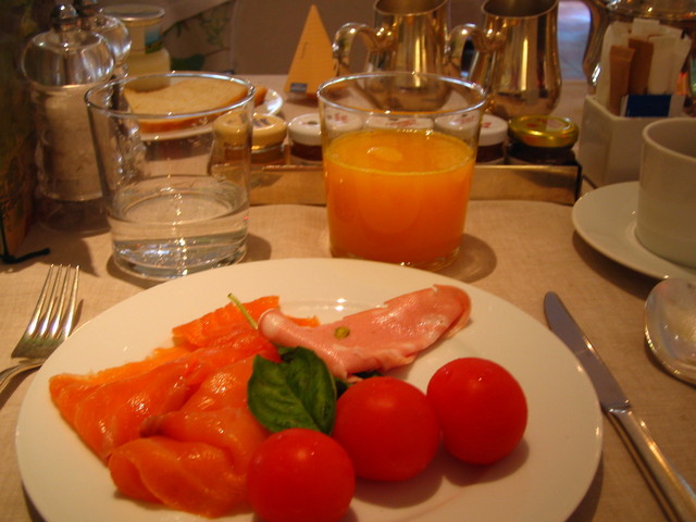 さて、多くの観光客が訪れるスペイン広場から西へ300mぐらい歩いた所にポポロ広場があり、その右手前にHotel de Russieの入り口がひっそりとあります。入り口に制服をまとった大きなドアマンが二人立っていますのでホテルだと分かりますが、注意しないと目立ちません。このホテルには10回近く宿泊しているのでレセプションでもリストランテでも顔を覚えてくれるようになりました。ここのメインダイニングがLe Jardin de Russieです。朝食はブッフェ形式がメインになりますが、もちろんアラカルトでも食べることができます。夕食はメインダイニングルームで恭しく給仕され、ローマの食材を使ったイタリア料理がとてもおいしいです。お奨めはテラスで食べる昼食です。知る人ぞ知るLe Jardin de Russieのテラスはホテルのエントランスを真っ直ぐ抜けたパティオに連続して配置され石段を上った場所にあります。緑に囲まれたテーブルには多くの観光客(宿泊客でない)が爽やかな風とキラキラする陽光を浴びながら食事をしています。美しい女性を連れたカップルやお年寄りの夫婦が楽しそうに会話をしながらローマに流れる悠久の時を満喫しているようです。