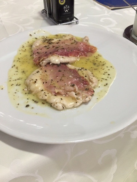 ワインを頼み、スープ類、サラダ、豚肉と生ハムを重ねたものを注文〜