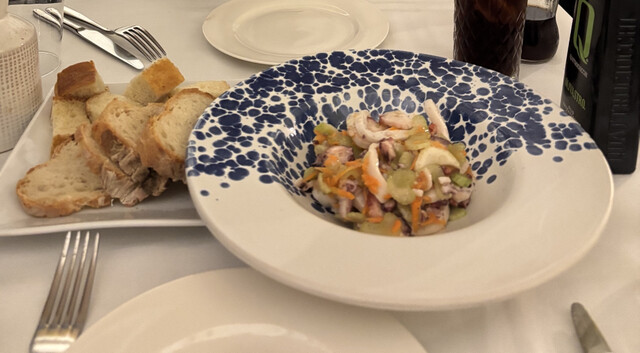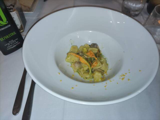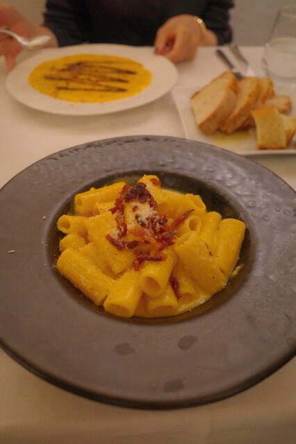 ローマテルミニ駅からバスを利用して行きましたが歩いて行くことも可能です。海鮮サラダ、カルボナーラ、カボチャのリゾットをオーダーしました。カルボナーラはチーズの味が濃厚すぎてお酒と一緒だと美味しく味わえ...