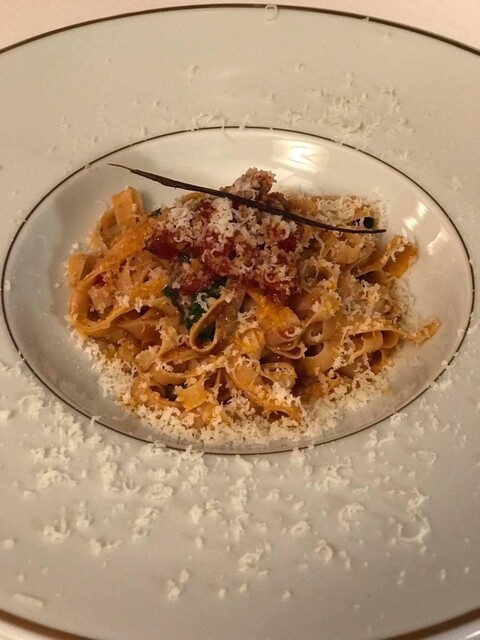 から始まるクラシカルメニュー。穏やかな料理で奇才の片鱗は伺えない。勧めてくれる地元ラッィオ州のグラスワインもトラットリア並み。