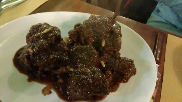 で、アンティパストには当然のようにプンタレッレをお願いして、ワイフはcicoria ripassata in padellaをパンに乗せたBruschetta、私は如何にもこの店らしいQuinto quarto:5/4(変拍子ぢゃないよw)と書かれたメニューからanimelle arrostoを選びました。
