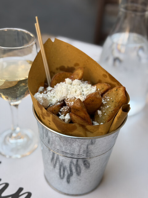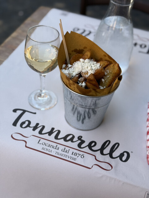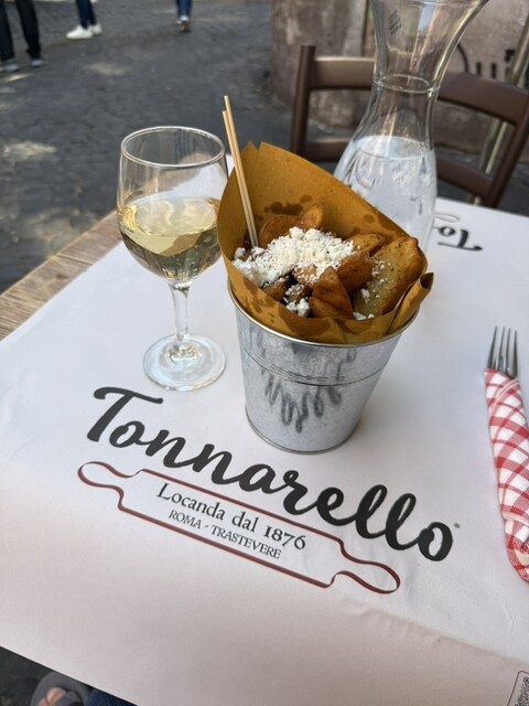 まずはローマ名物カチョエペペのポテト。ポテトに塩と胡椒とチーズが載ってます!という素朴な味。