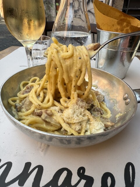 さらにこれもローマ名物のカルボナーラパスタ。日本と違って生クリームを使ってないのはいいが、結局、ハムの塩気で食べさせる。これがとにかく辛い!日本のカルボナーラのほうがいいかも。
