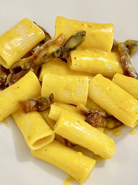 ワイフはトマトつながりでそのままトマトソースのスパゲッティ、私はリガトーニのカルボナーラです。