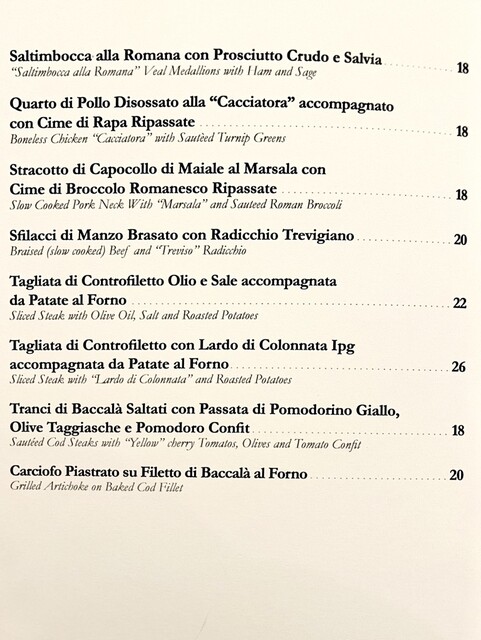ワインは同じくラツィオのnello buonoという極めて造り手が少ないという赤をいただいて、ワイフはStracotto di Capocollo di Maiale al Marsala:マルサラ酒に浸けた豚肉のカポコッロ(生ハム)の堅焼き、私はQuarto di Pollo Disossato alla Cacciatora:骨を抜いた鶏モモ肉のカチャトーラをいただくことにしました。