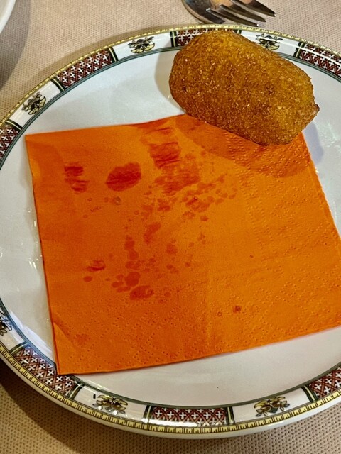メニューには載っていませんが厨房の手前にたくさん積んであったプンタレッレはお願いするとして、偶にはSuppliとFiletto Baccalaをアンティパスト代わりに食べてみることにします。