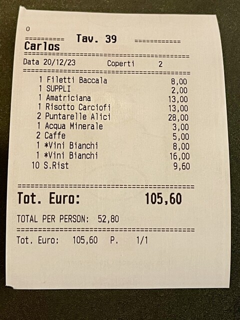 プンタレッレお代わりしちゃったからメイン食べてないのに100€超えましたw 場所柄コスパは良くありません でもスップリのお代わりした分はついてないな
