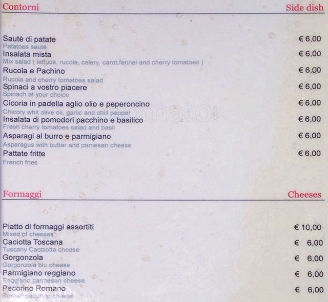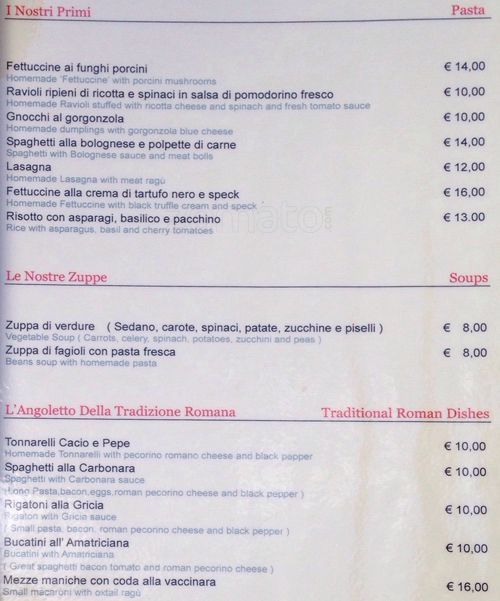 表のメニューはイタリア語のみで、店内で出されたメニューは英語併記でした(そりゃそうだ)が、ローマの基本的な料理はすべて用意されていて、辺りのテーブルを見渡すとボリュームもかなりあるので、典型的なローマ下町料理が食べられる店とわかります。