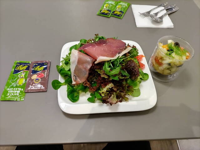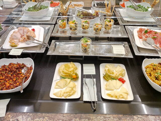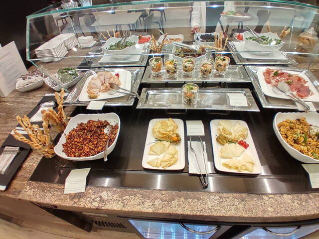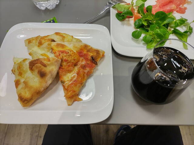 出国手続きをして「ラウンジ」に入りました。初めはサラダやハム・チーズ程度しかなかったので、サラダをいただいたり、生ハムやチーズで赤ワインを楽しんでいると、18時半くらいからいい匂いがしてきて、温かいバスタや焼きたてのビザが出てきました。コーラを飲みながらイタリアの食を楽しむことができました。