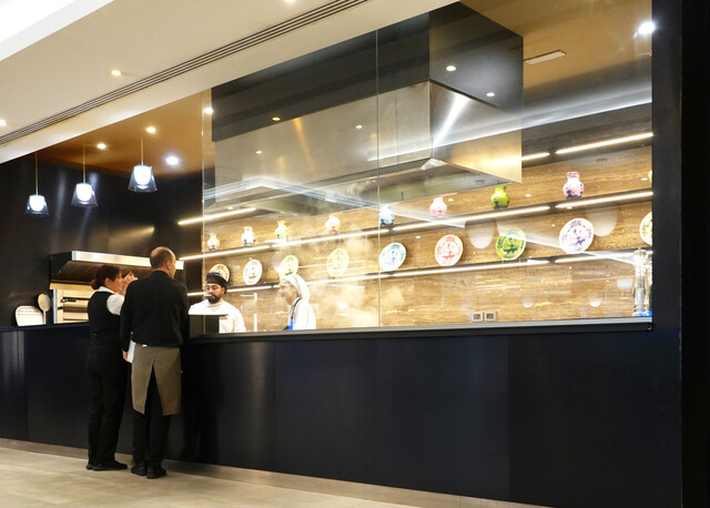 でていて奥にピッツァ用のオーヴン、中央にフード・コーナー・・グリッ