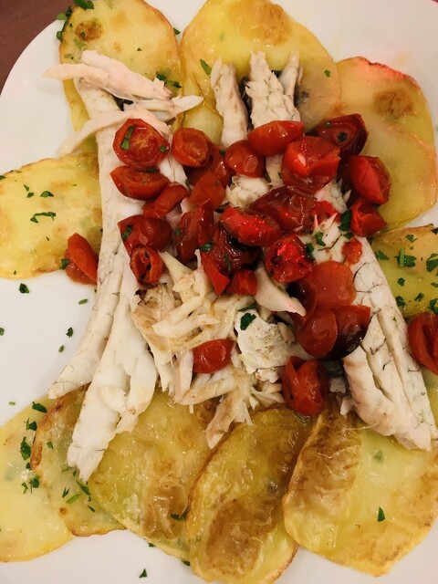 ほわっとふっくら焼き上げられたスズキ。塩は馬鈴薯側に振られています。一緒に食べるとより最高。